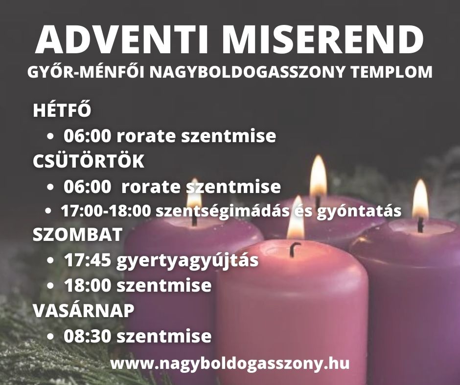 Ménfő | hétfő 06:00 Szentségimádás és gyóntatás minden csütörtökön 17:00-tól |